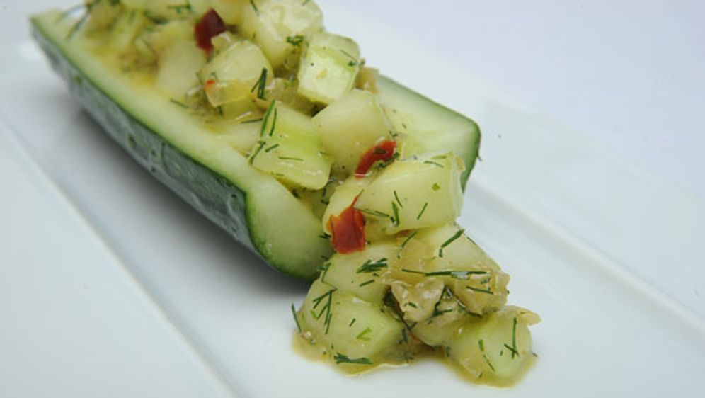 Nach der Verkstigung entscheiden die Testesser ob sich Rosins Einsatz gelohnt hat. 4 Portionen 500g Joghurt 1 Gurke 3 Zehen Knoblauch 100ml Olivenl Saft einer frischen Zitrone Salz Pfeffer Zubereitung Die Gurken halbieren und die Kerne aus der Mitte entfernen.